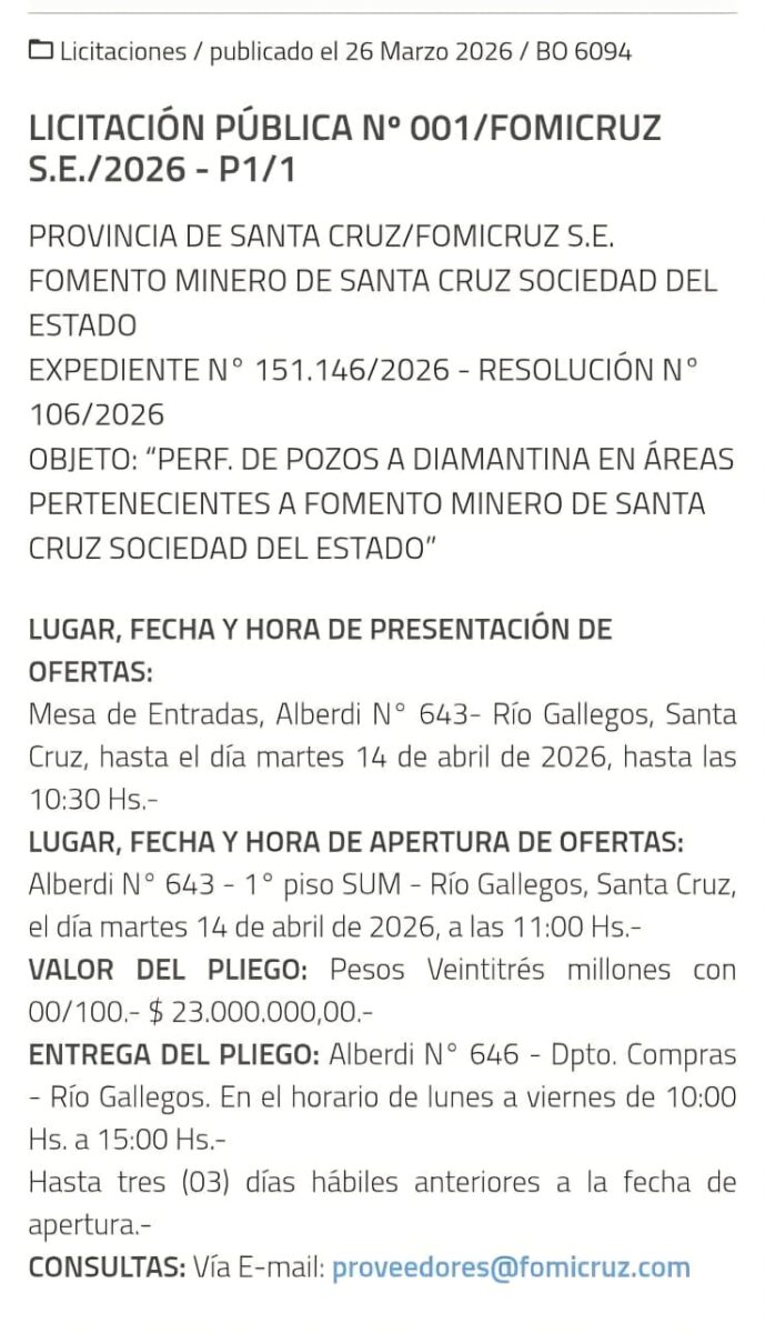 La empresa estatal Fomicruz ha dado inicio a un proceso de licitación pública orientado a la contratación de servicios de perforación diamantina y de aire reverso. Estas labores se llevarán a cabo en diversas áreas de interés geológico dentro del territorio de Santa Cruz, con el firme propósito de avanzar en el conocimiento de los recursos minerales existentes y potenciar la actividad extractiva provincial.
